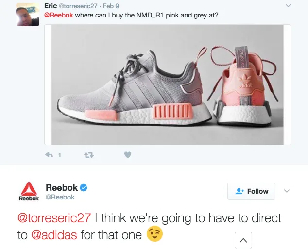 Just take a look at one funny example, where Eric did not notice the brand’s name of the trainers and asked Reebok about them. Reebok answered the question and directed the guy to the competitor.