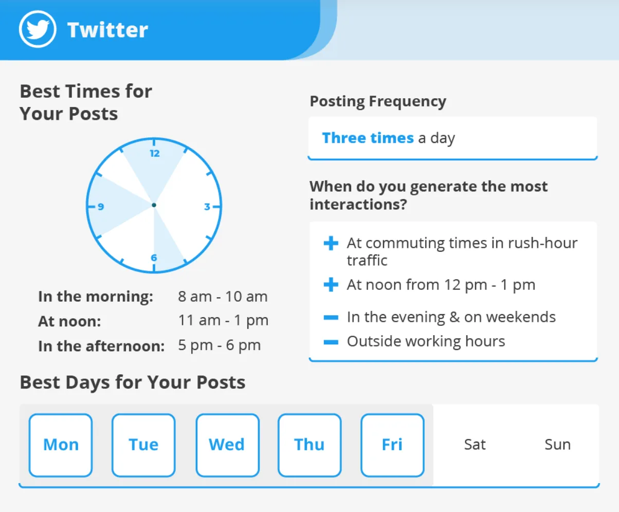 If you post on Twitter while your target audience is not active, you will not hit the bullseye. Use analytics to determine when users are most active and ready to interact with content. According to the universal statistics in terms of the best times to post on social media in 2021, you should pay attention to the following: