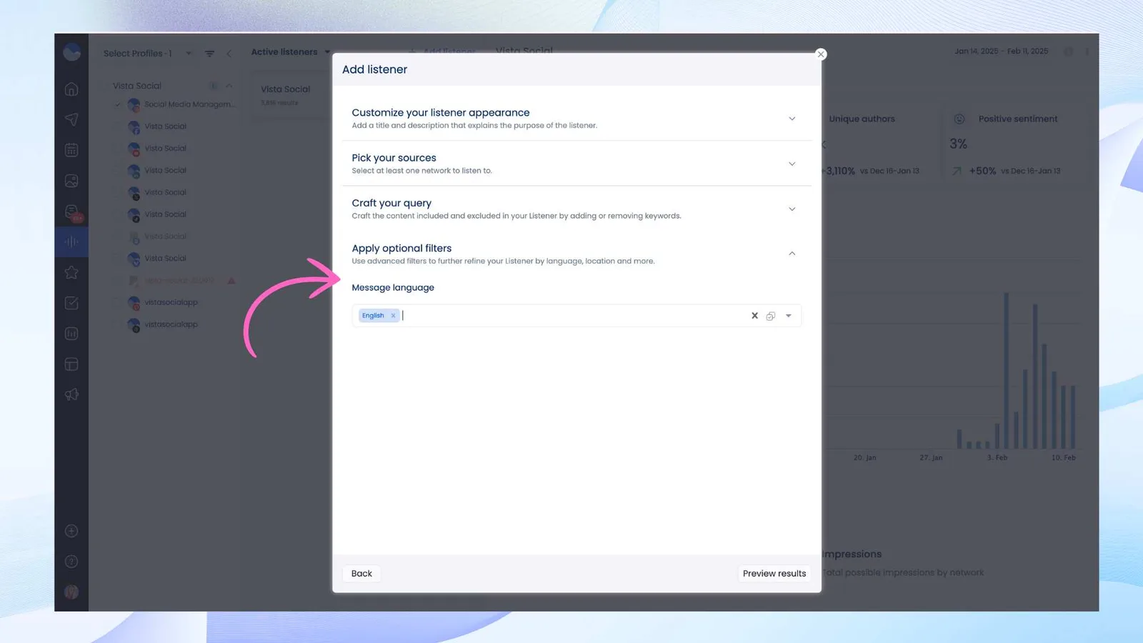 11. Apply optional filters to refine your Listener by language, location, etc.