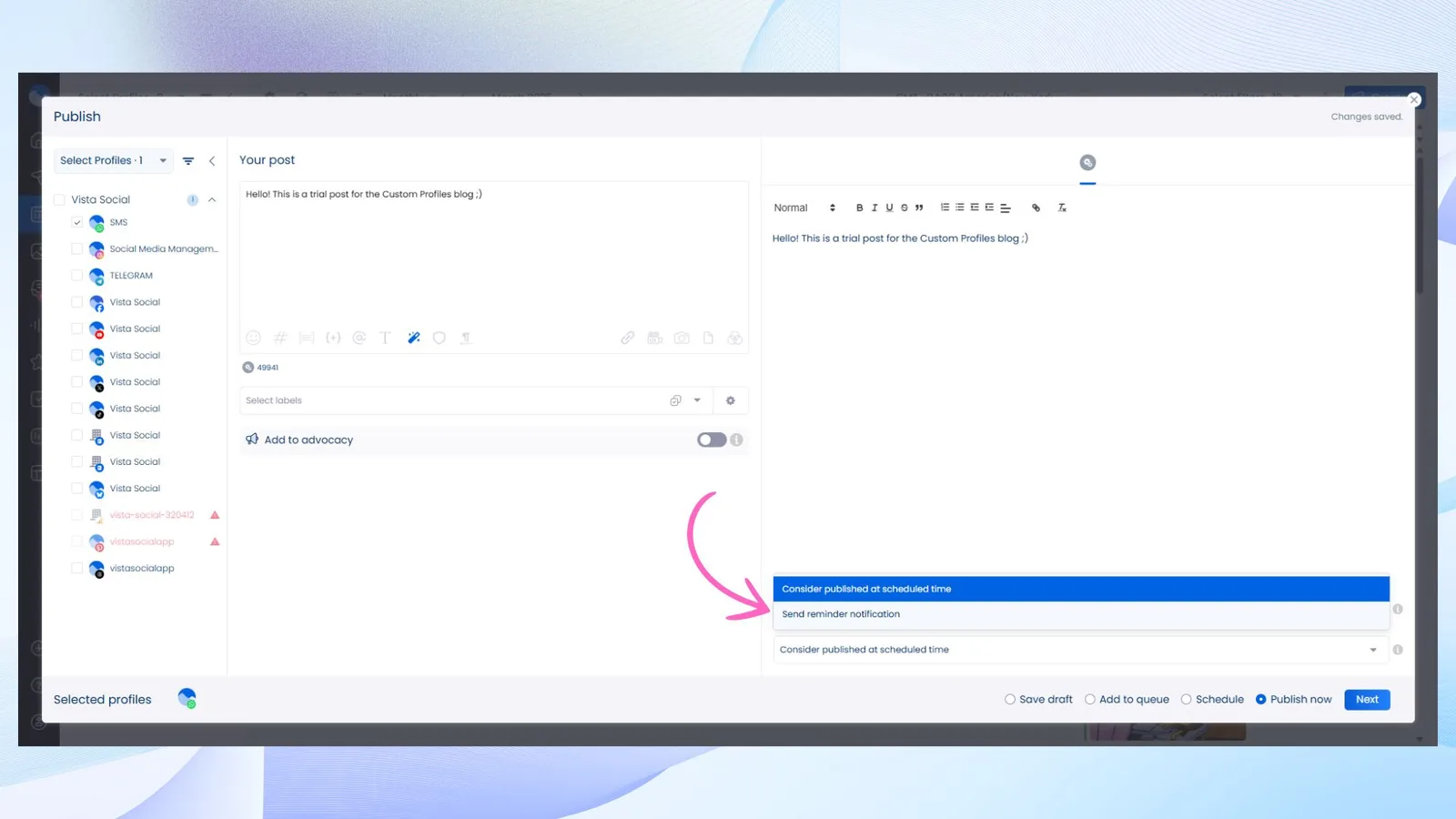 Reminder notifications help you send timely emails to designated team members, prompting them to publish on Custom Profiles at the scheduled time.